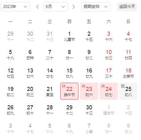 值得關注的是,五一之后下一個節(jié)假日就是端午節(jié),網(wǎng)友發(fā)現(xiàn),端午節(jié)和五一同樣需要調(diào)休:今年端午節(jié)是6月22日,22日-24日放假,25日(周日)上班。也就是說,法定放假一天,但打亂了正常雙休,25日(周日)調(diào)休一天,假期后再連續(xù)上班6天。