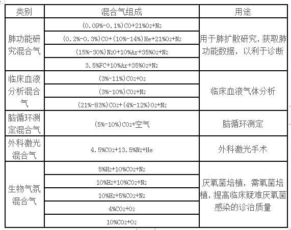 臨床醫(yī)學(xué)、衛(wèi)生防疫、醫(yī)療和生物研究等領(lǐng)域需用的混合氣體,主要品種有:肺功能研究混合氣、臨床血液氣體分析用混合氣、腦循環(huán)測(cè)定混合氣、外科激光混合氣、生物氣氛混合氣以及組織當(dāng)量混合氣等。